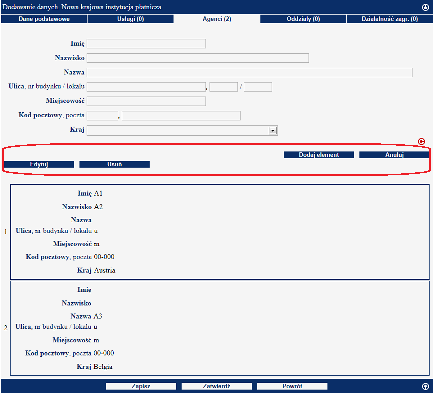 W zakładkach 'Agenci', 'Oddziały' oraz 'Działalność zagr.' elementy są przechowywane w postaci listy numerowanej kolejnymi liczbami naturalnymi.