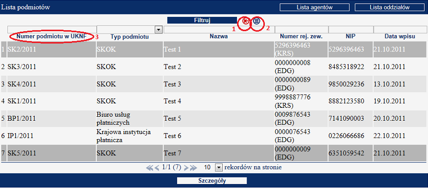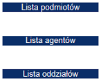Lista podmiotów wygląda następująco (listy agentów i oddziałów wyglądają analogicznie):